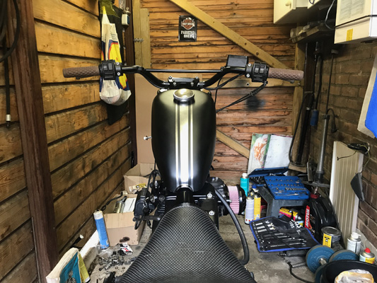 Achterbrug en voorvork er in, olievat erop het begint weer op een motor te lijken.